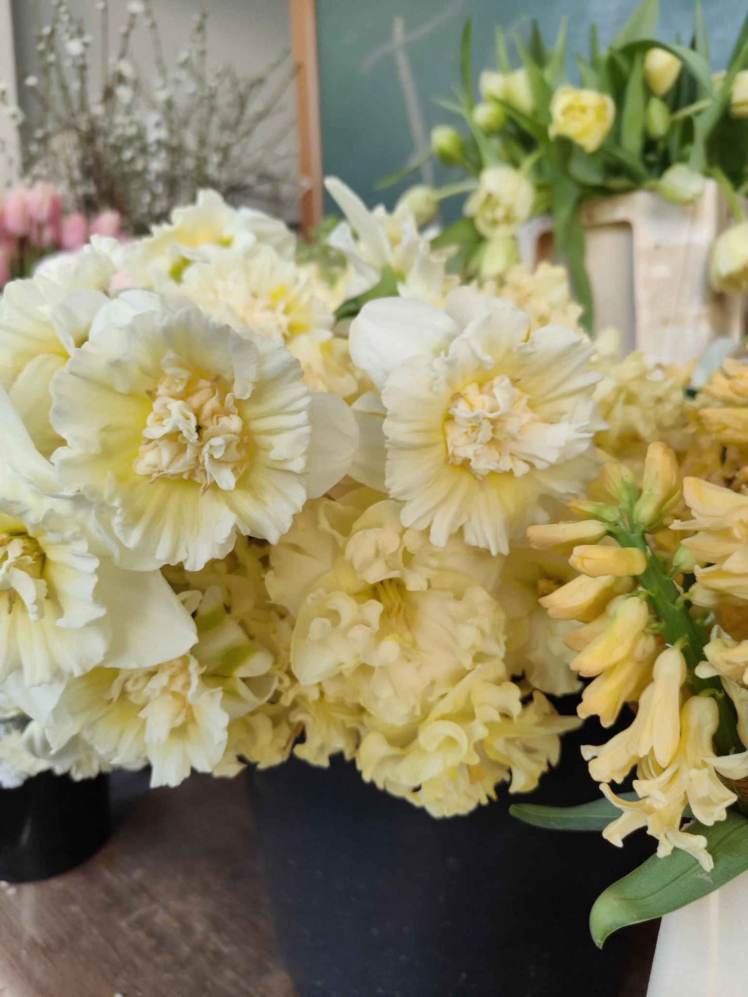 Per la seconda composizione ho selezionato una palette delicata nelle molteplici sfumature del giallo e bianco . E qui mi sono sbizzarrita sempre con fiori primaverili tra cui i muscari, rami di pesco, anemoni e diverse tipologie di narcisi.