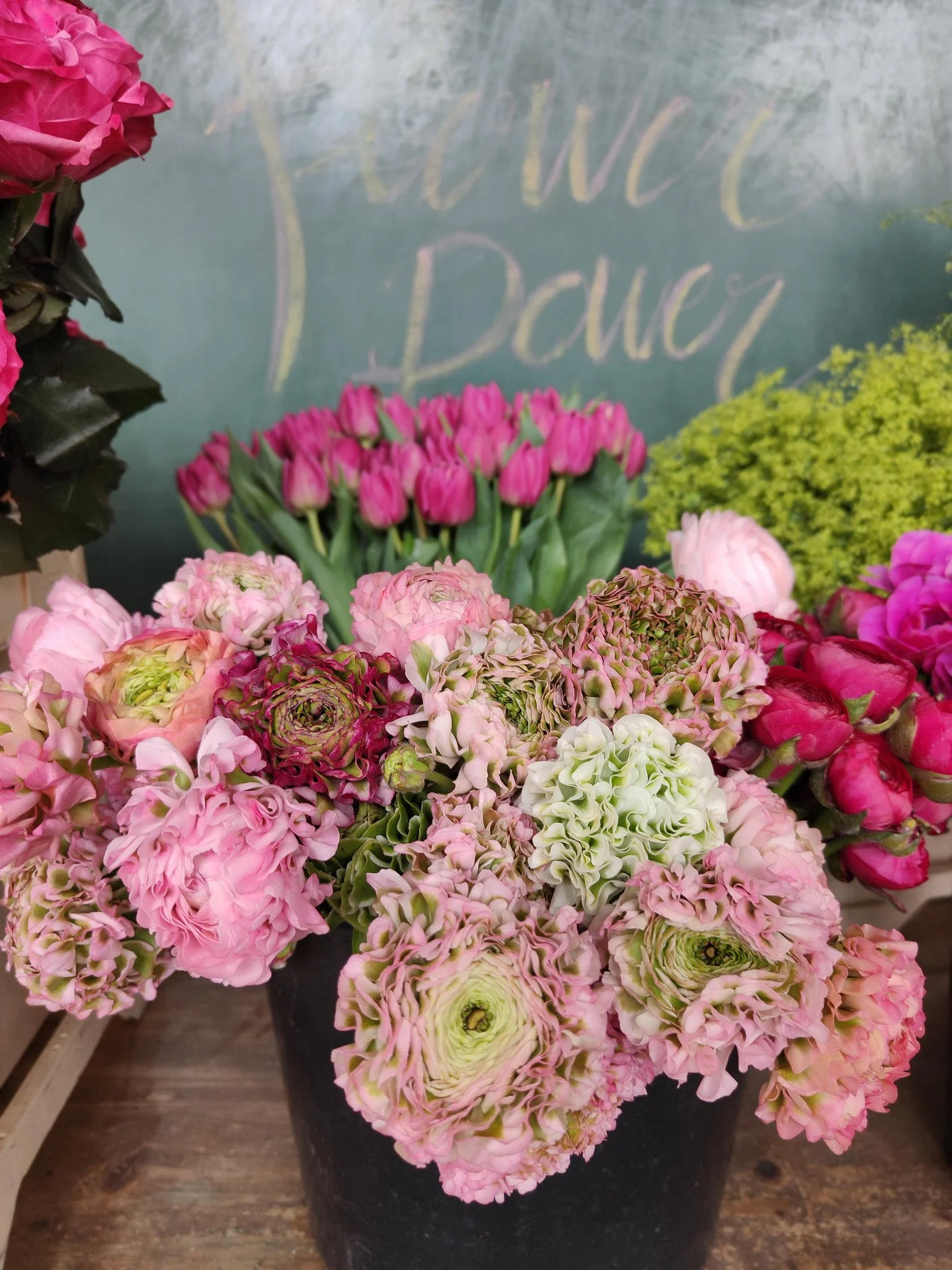 Per il bouquet ho scelto una palette a contrasto: delicate nuance di rosa abbinate all’intensità di diverse sfumature di bordeaux. Tra i fiori ho prediletto quasi tutti fiori stagionali: tulipani doppi, anemoni, ranuncoli, ranuncoli butterfly, fiori di pesco, e ginestra. Ogni fiore ha il suo carattere, il suo portamento, la sua forma. La bellezza di un bouquet sta nel lasciare a ogni elemento il suo spazio creando un unicum armonico.