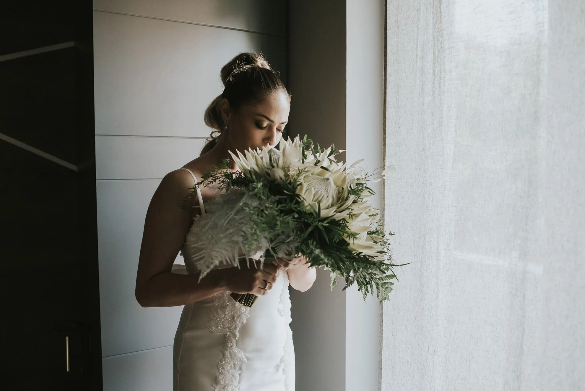 Naturalmente anche il bouquet della sposa era composto dalle regine indiscusse, le protee accostate alla lunaria perlacea, felce e plumoso bianco.